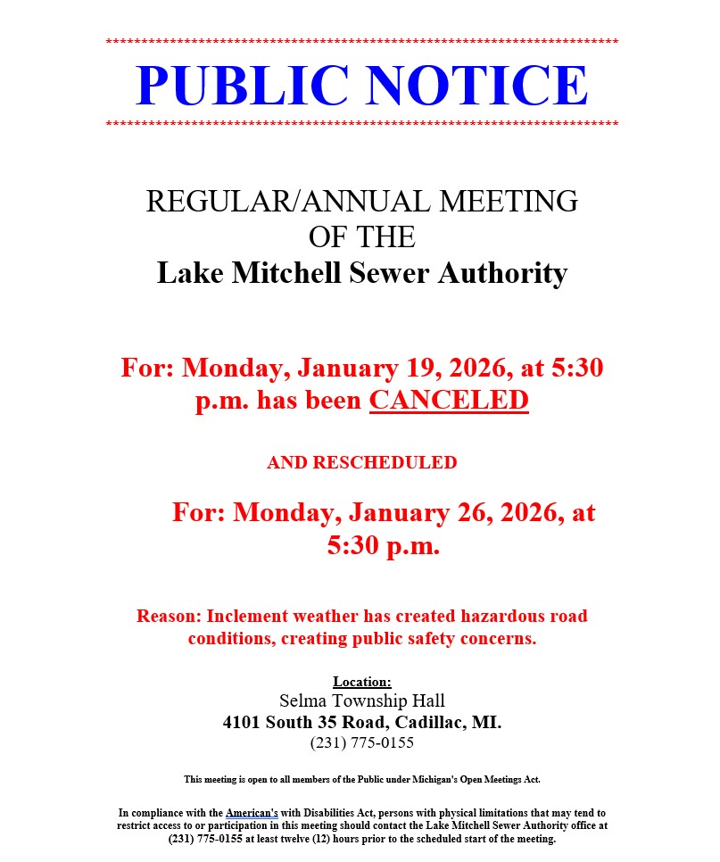The Lake Mitchell Sewer Authority meets on the third Monday of each month at 5:30 p.m. The meetings are open to all members of the public under the Michigan's Open Meeting Act. At LMSA's LMSA Meetings will be held at the Selma Township Hall, located at 4101 South 35 Road, Cadillac, MI. Please note: Meeting dates do change from time-to-time. You may call the LMSA office during normal business hours at 231-775-0155 to confirm if the meeting date/time has been canceled or changed. It will also be posted to this website as well. The LMSA Board is a 5-member board that consists of (3) Township Supervisors (Clam Lake, Selma, Cherry Grove), and (2) LMSA Sewer Users.
